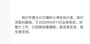 工作室微博证实演员于朦胧已坠亡